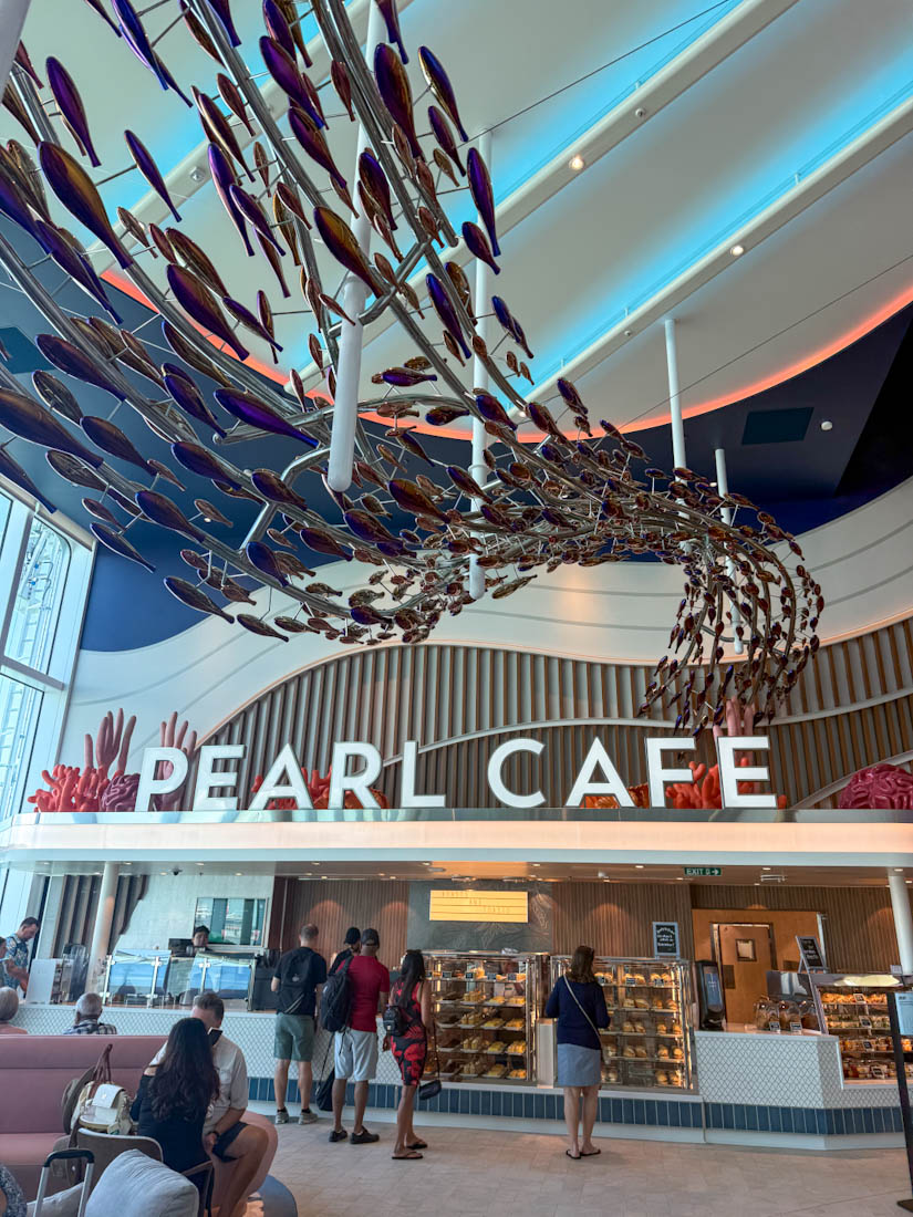 The massive pearl sitting in the center is impossible to miss, though we’re still not entirely sure what it represents beyond being a stunning focal point. Inside the pearl structure on Deck 6, you’ll find the Pearl Café, which feels more like a high-end New York café than a cruise ship dining spot. Hot and cold drinks, fresh food, incredible variety, all in a space that invites you to linger and watch the wide open sea from it’s huge windows.